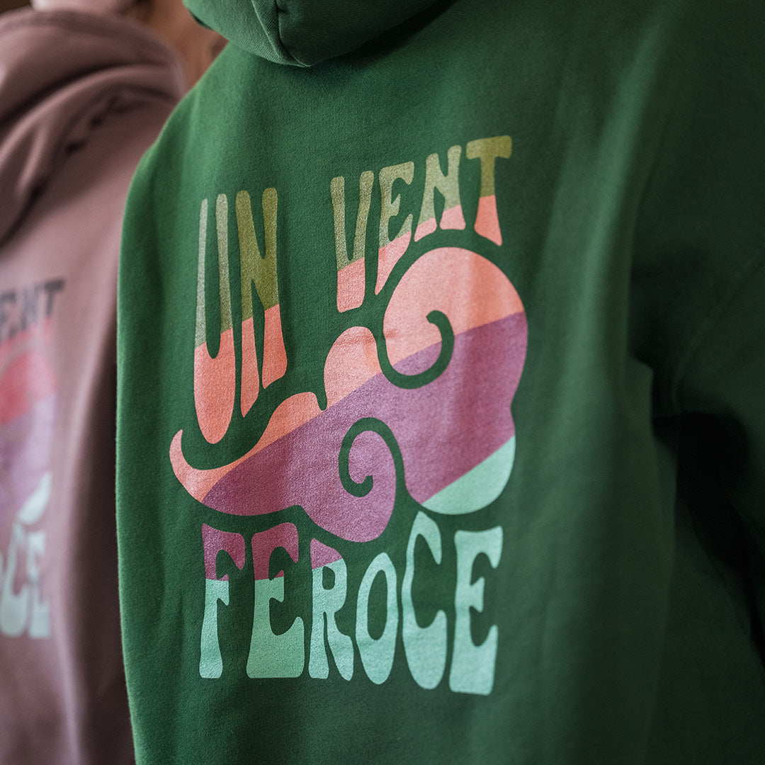 Le Hoodie" Le Vent" en coton 100% bio est disponible en vert sapin, bleu et rose. Tailles disponibles : du XS au double XL.