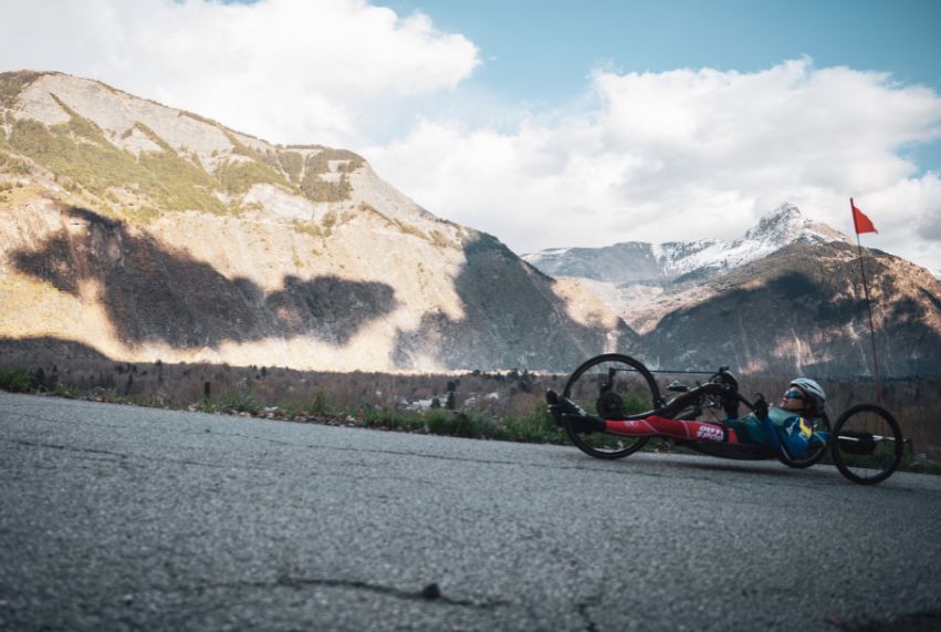 Un accident en montagne, en mars l’année dernière, a marqué un tournant dans ma vie. Depuis je suis paraplégique, je me déplace en fauteuil roulant mais l’envie de se dépenser est d’autant plus forte. J’ai découvert le vélo à bras, handbike assez rapidement et j’ai commencé à m’entraîner ce printemps. C’est une activité qui a du sens pour moi par l’effort, la liberté et l’autonomie procurée. C’est un immense plaisir de pouvoir se rapprocher de l’environnement extérieur en empruntant les routes et cols de montagne.